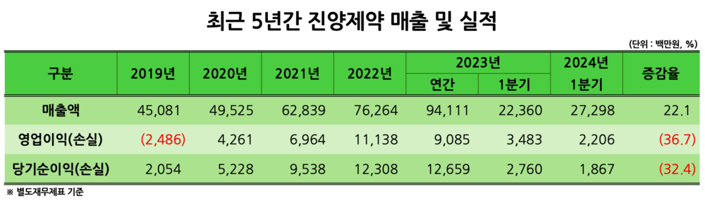 다만 진양제약은 1분기 영업이익과 당기순이익에서 전년 동기 대비 감소한 모습을 보였는데, 이는 판관비와 매출원가 증가 영향이 컸다. 진양제약은 이번 분기 판관비로 전년 동기 99억 5600만원 대비 52.9% 증가한 152억 2100만원을 지출했다. 특히 일반적으로 판매대행 혹은 광고대행과 관련된 지급수수료 부분에서 전년 동기대비 85.3% 증가한 89억 9700만원을 지출했다.