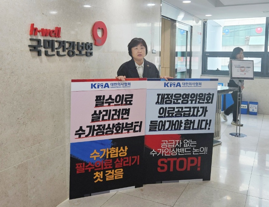 28일 대한의사협회 최안나 총무이사 겸 보험이사가 국민건강보험 재정운영위원회 소위원회(재정소위) 2차 회의가 열리는 건보공단 스마트워크센터 앞에서 1인 시위를 하며 이 같이 말했다.