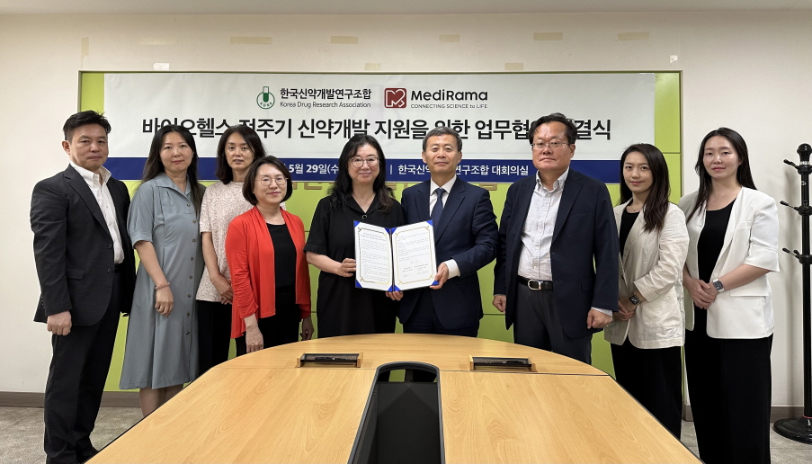 협약식은 신약조합 대회의실에서 한국신약개발연구조합 여재천 상근이사, 조헌제 전무이사, 정혜림 차장, 한상아 과장대리와 메디라마 문한림 대표, 서수경 부사장, 임윤아 부사장, 이미경 전무, 강희석 이사 등 양 기관 관계자가 참석한 가운데 진행됐다.