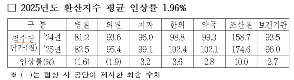 의약단체들은 3년간 지속된 건보공단 재정수지 흑자를 기반으로 한 충분한 수가 개선을 요구했지만 2025년도 환산지수 인상률은 지난해(1.98%)와 비슷한 수준으로, 평균 1.96% 인상을 기록했다.