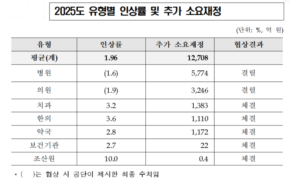 이에 따라 추가 소요 재정은 약 1조2708억원으로, 유형별로는 병원 1.6%, 의원 1.9%, 치과 3.2%, 한의 3.6%, 약국 2.8%, 보건기관 2.7%, 조산원 10%로 결정됐다. 이번 협상에서 치과·한의·약국·조산원·보건기관 유형은 타결됐고, 병원·의원 유형은 최종 결렬됐다.