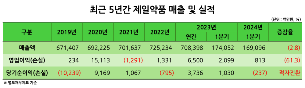 지난 16일 제일약품 1분기 분기보고서에 따르면 회사는 별도재무제표 기준 1분기 매출 1691억원으로 전년 동기 대비 2.8% 감소한 수치를 기록했다.