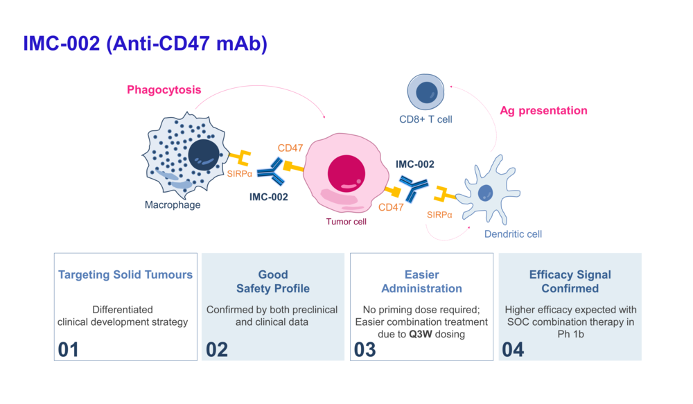 IMC-002는 대식세포에 대한 면역관문억제제로서 암세포의 CD47과 대식세포의 SIRPα 간의 'don’t eat me' 신호를 차단하여 대식세포가 암세포를 공격할 수(phagocytosis) 있도록 돕는 약물이다. IMC-002는 적혈구 등 정상세포에 대한 결합을 최소화하여, 안전성이 높은 약물로 그림과 같이 차별화된 특징을 가진 2세대 CD47 항체이다.