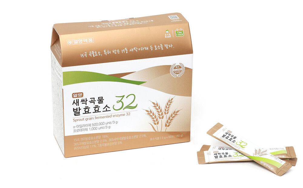 '일양 새싹곡물 발효효소32'은 15종 곡물과 17종의 새싹+과채 등을 인위적으로 정제하지 않고 효소활성을 높여 발효한 효소식품이다.