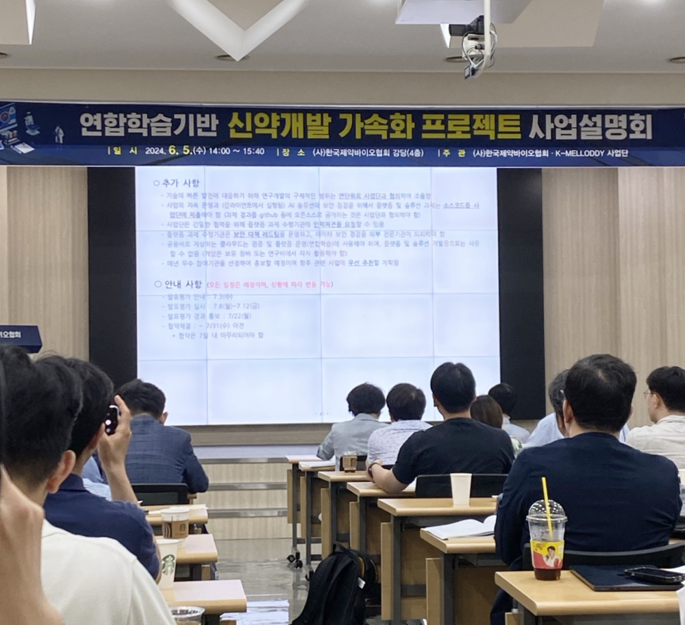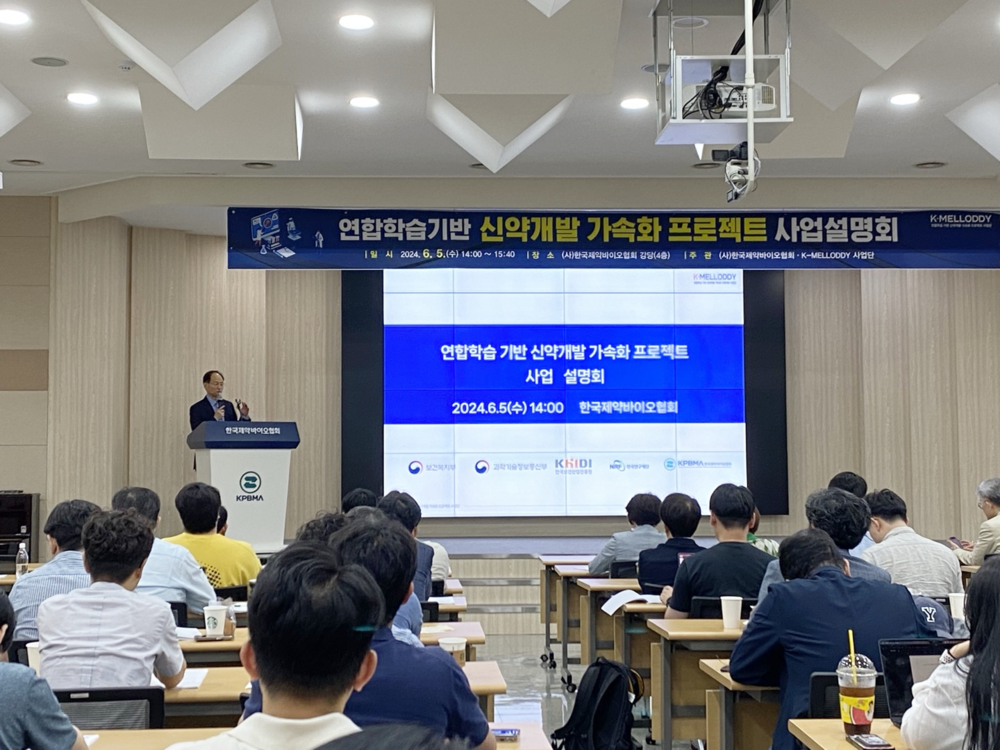 한국제약바이오협회 K-MELLODDY 사업단은 지난 5일 제약바이오협회 강당에서 제약·바이오업체, 의료기관 등 이해관계자를 대상으로 데이터 활용 신약 개발 협력 체계 구축을 비롯한 공모 과제 내용을 설명하며, 다양한 의견을 청취했다.