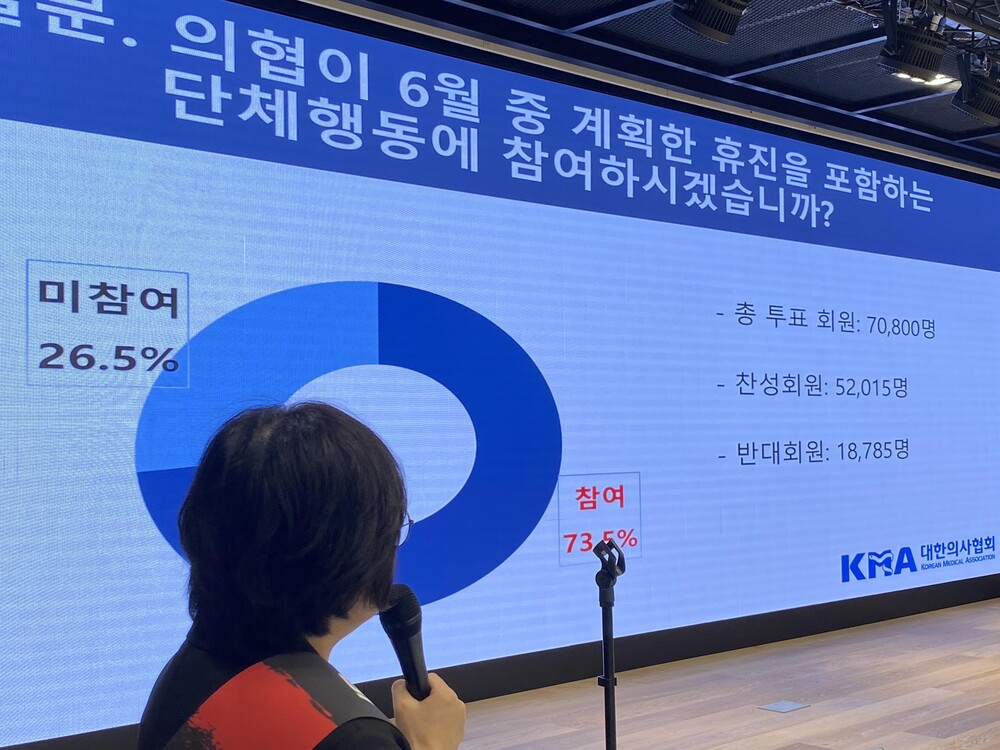 이날 의협이 공개한 전 회원 투표 결과에 따르면 전체 의사 가운데 46.49%는 단체행동 참여 의사를 밝혔다. 실제 참여로 이어질 경우 오는 18일 전국 의사 절반가량은 휴진에 동참하게 되는 셈이다.
