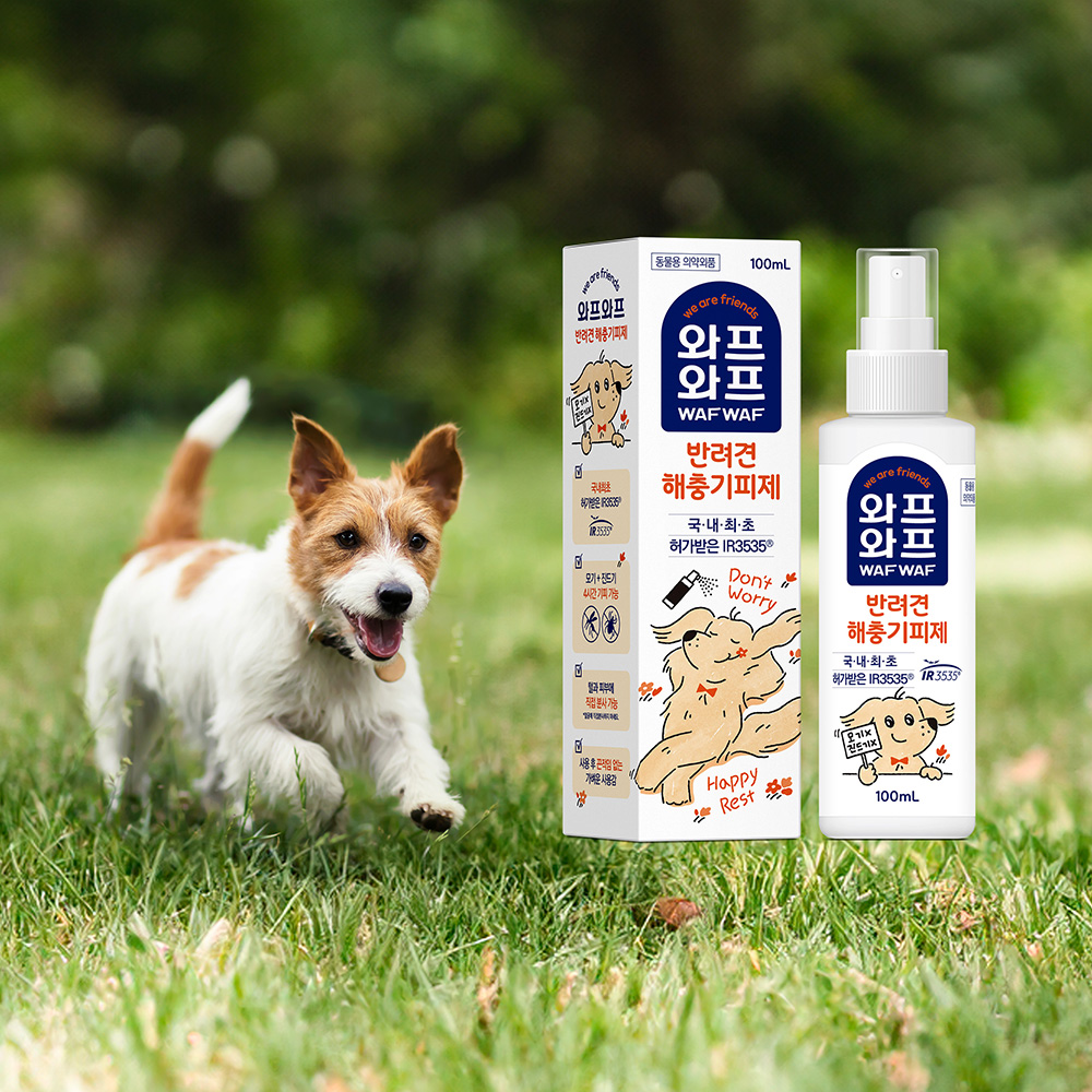 와프와프는 반려동물의 몸에 뿌려 모기와 진드기 등의 접근을 막는 스프레이 타입의 제품으로, 해충 기피 효력은 물론, 안전성과 관련한 임상 테스트 등을 거쳐 농림축산검역본부 허가를 취득한 동물용의약외품이다.
