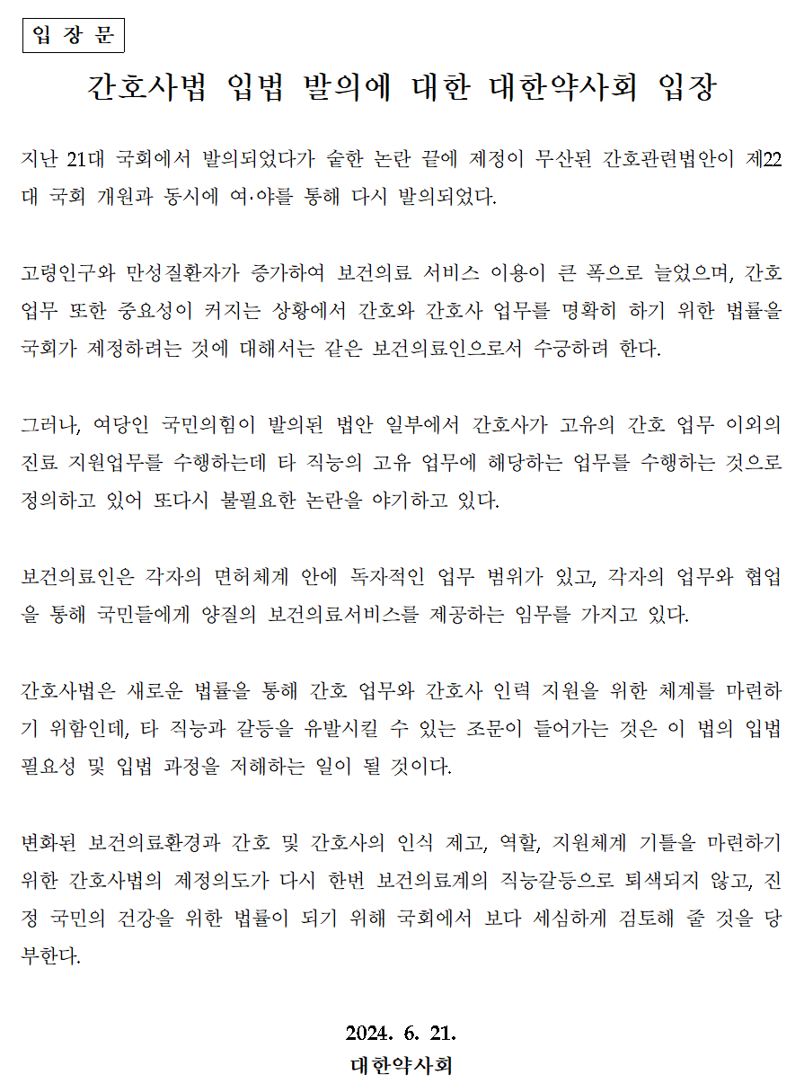 약사회는 입장문에서 "간호사 업무를 명확히 하기 위한 법률을 국회가 제정하려는 것에 대해서는 같은 보건의료인으로서 수긍하려 한다"고 말했다.