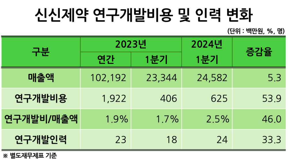 이같은 연구개발 사업 확대는 외형적 성장과 함께 추진되고 있다. 신신제약은 올해 1분기 별도재무제표 기준 246억원의 매출을 기록했다. 이는 전년 동기 233억원 대비 5.3% 증가한 수치로, 창사 이래 1분기 최대 매출 기록이기도 하다.