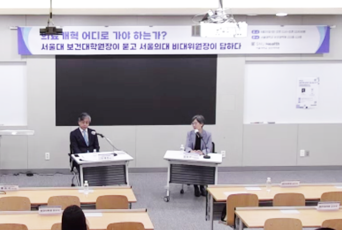 25일 '의료개혁 어디로 가야 하는가?'를 주제로 서울대학교 보건대학원 221동 113호에서 이태진 서울대 보건대학원장과 강희경 서울의대비대위원장간 긴급대담이 진행됐다.
