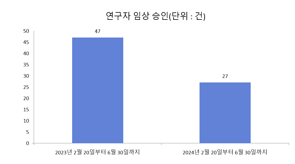 식약처 자료에 따르면, 빅5 병원 전공의가 사직서를 제출한 다음 날(2월 20일)부터 지난달 30일까지 연구자 임상 승인 건수는 27건으로, 전년 동기 대비 약 42.6% 줄었다.