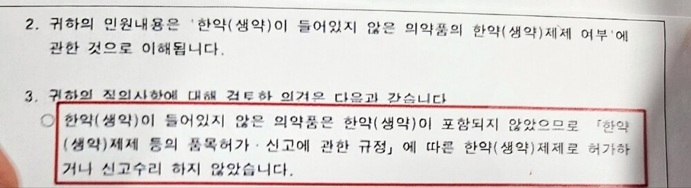 이에 대해 식약처는 서면을 통해 '한약(생약)이 들어있지 않은 의약품은 한약(생약)이 포함되지 않았으므로, '한약(생약)제제 등의 품목허가·신고에 관한 규정'에 따른 한약(생약)제제로 허가하거나 신고수리 하지 않았다'고 답변한 것으로 확인됐다.