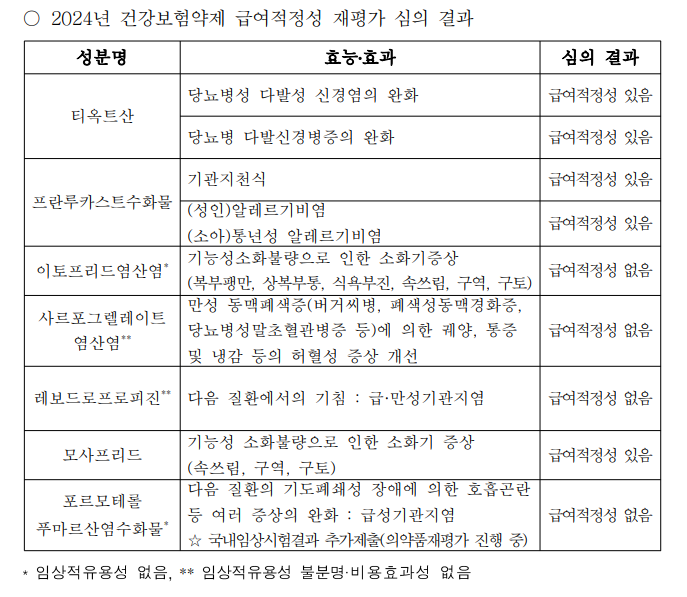 심의 결과, 사르포그렐레이트염산염과 레보드로프로피진, 이토프리드염산염, 프로모테롤 푸마르산염수화물 등 4종은 급여적정성이 없다고 결론지었다.