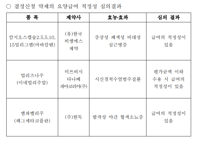 이와 함께 폐색성 비대성 심근병증 치료 신약인 한국BMS제약 '캄지오스(마바캄텐)'는 약평위를 통과했다.