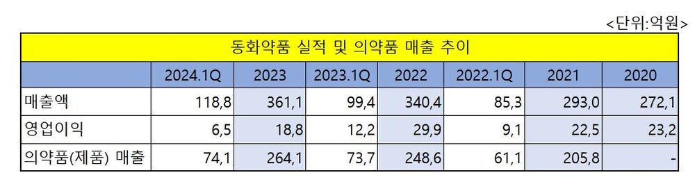 5일 전자공시시스템에서 확인한 동화약품 사업보고서에 따르면, 올해 1분기 동화약품의 의약품(제품) 매출은 741억원으로 집계됐다. 지난해 같은기간 737억원, 2022년 611억원과 비교하면 매년 꾸준히 증가하고 있는 추세다.