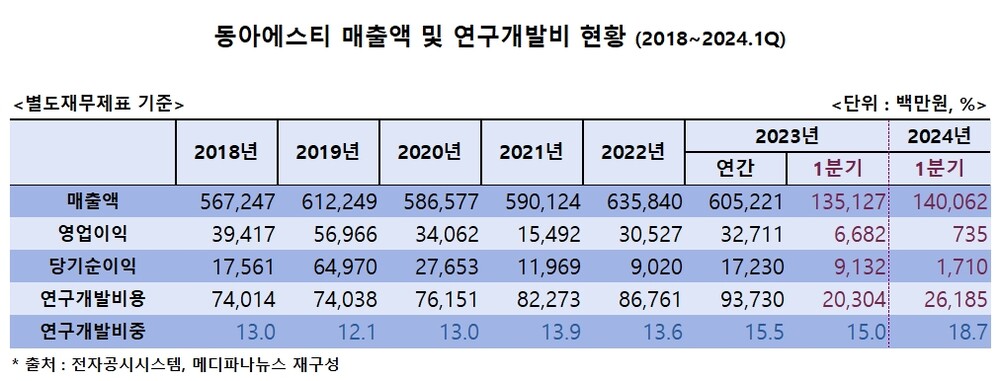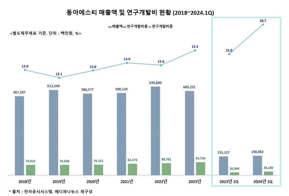 7일 금융감독원 전자공시시스템을 통해 확인한 동아에스티 사업보고서에 따르면, 동아에스티 연구개발 비용은 2018년부터 6년 연속으로 증가하고 있다.