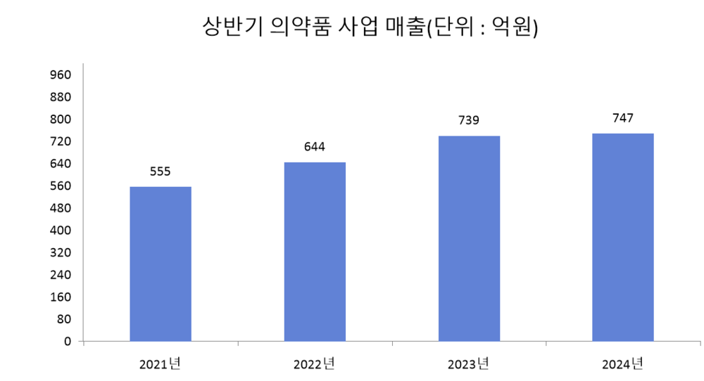 15일 금융감독원 전자공시시스템에 따르면, 이 회사는 올해 상반기(지난해 12월부터 지난 5월까지)에 의약품 사업 부문에서 매출 747억원을 달성했다. 해당 매출은 전년 동기 대비 약 1% 늘어난 수치다. 지난해 상반기와 비교해 매출 증가 폭은 줄었으나, 추세를 이어간 모양새다.