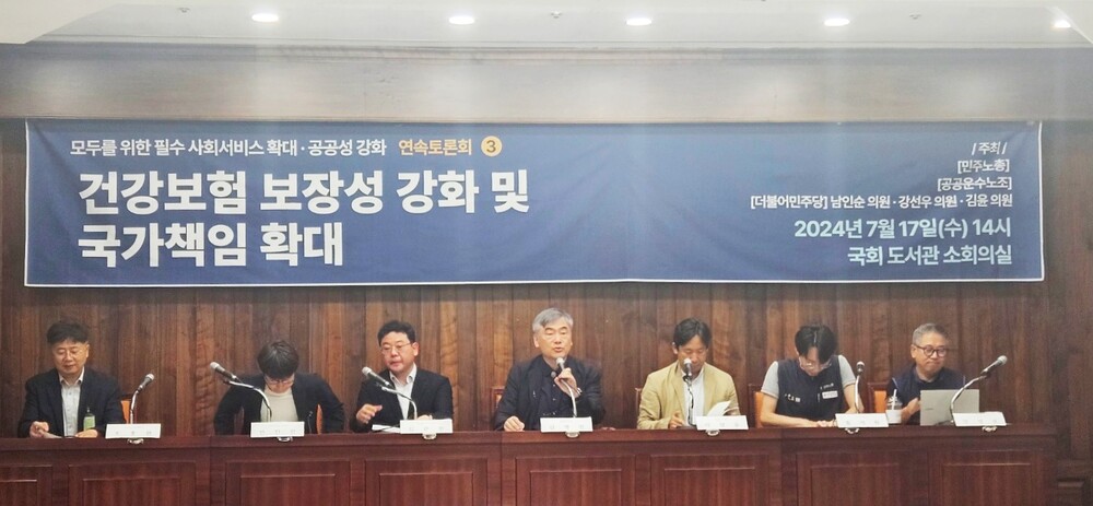 17일 '건강보험 보장성 강화 및 국가책임의 확대'를 주제로 '모두를 위한 필수 사회서비스 확대·공공성 강화' 연속토론회3이 국회도서관 소회의실에서 개최했다.