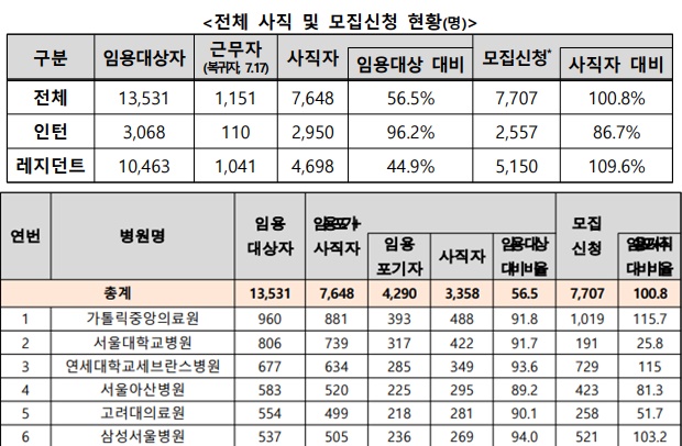 수련병원은 하반기 전공의 모집에 총 7707명 모집 인원을 신청했다. 사직처리 규모인 7648명보다 많은 규모를 신청한 셈이다.