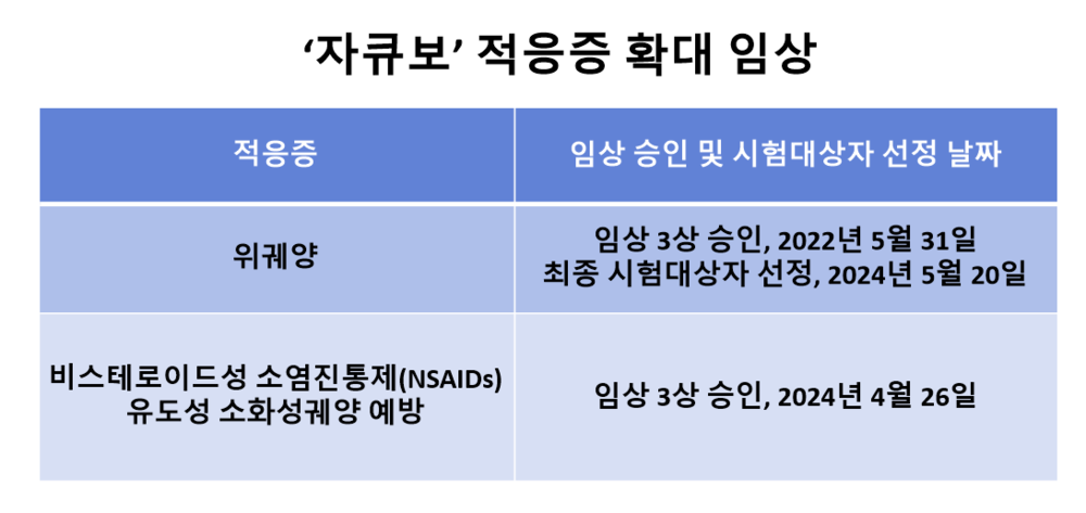 자큐보 투여 시 비스테로이드성 소염진통제(NSAIDs) 유도성 소화성궤양 예방 효과를 확인하는 3상도 승인된 상태다. 이번 임상에선 자큐보와 대조약 투여 후 24주 시점까지 소화성궤양 발생 대상자 누적 비율과 위 또는 십이지장 내시경적 출혈이 나타난 대상자 비율을 확인한다.