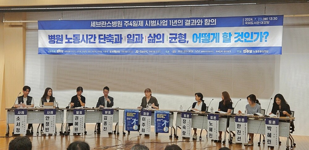 23일 '세브란스병원 주4일제 시범사업 1년의 결과와 함의-병원 노동시간 단축과 일과 삶의 균형, 어떻게 할 것인가?'에 대한 토론회가 국회도서관 강당에서 진행됐다.