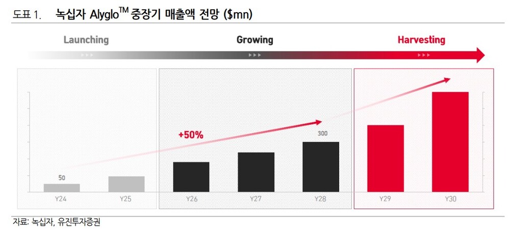 24일 유진투자증권 기업보고서에 따르면, 올해 알리글로 제품의 예상 매출액은 약 400억원으로 전망된다. 이후 2025년 800억원, 2026년 1450억원으로 추정했다.