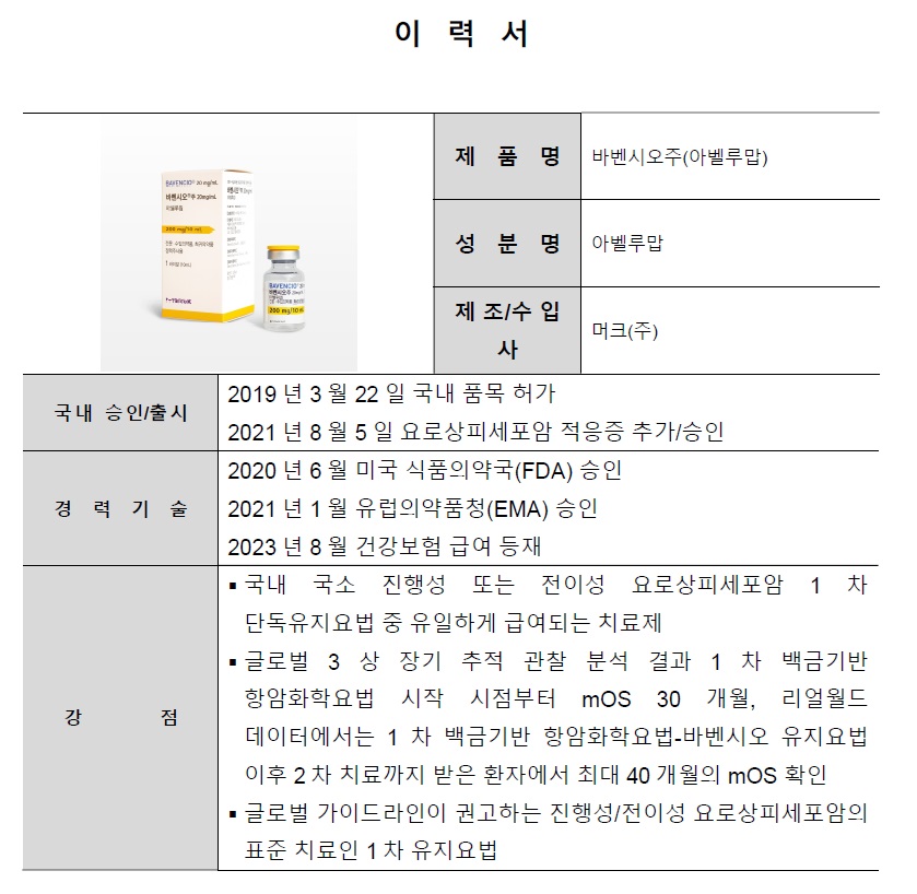 2021년 8월 국내 허가 이후 2년 만에 건강보험 급여를 적용받게 되면서, 현재 국내 요로상피세포암 1차 유지요법 옵션 중 유일하게 급여 혜택을 받을 수 있는 치료제가 되었습니다.