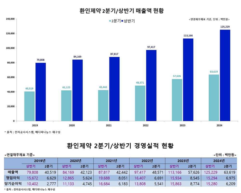 31일 전자공시시스템에 따르면, 환인제약 연결재무제표 기준 2분기 매출액은 636억원, 상반기 매출액은 1252억원으로 잠정 집계됐다.