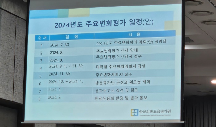 2024년도 주요변화평가 일정은 어제(30일) 2024년도 주요변화평가 계획(안) 설명회에 이어 8월 안에 주요변화평가 신청 안내를 한다. 이에 따라 해당 의대는주요변화평가 신청서를 접수해야 한다. 또 해당 의대는 주요변화계획서를 작성해서 판정 3개월 전인 11월 30일까지 접수해야 한다. 이를 통해 의평원은 12월부터 2025년 1월까지 방문평가단 구성과 워크숍을 개최하고, 1월 중 결과보고서 작성 및 검토를 하게 된다. 이후 2월 판정위워회에서 판정 및 결과를 해당 대학에 통보하게 된다.