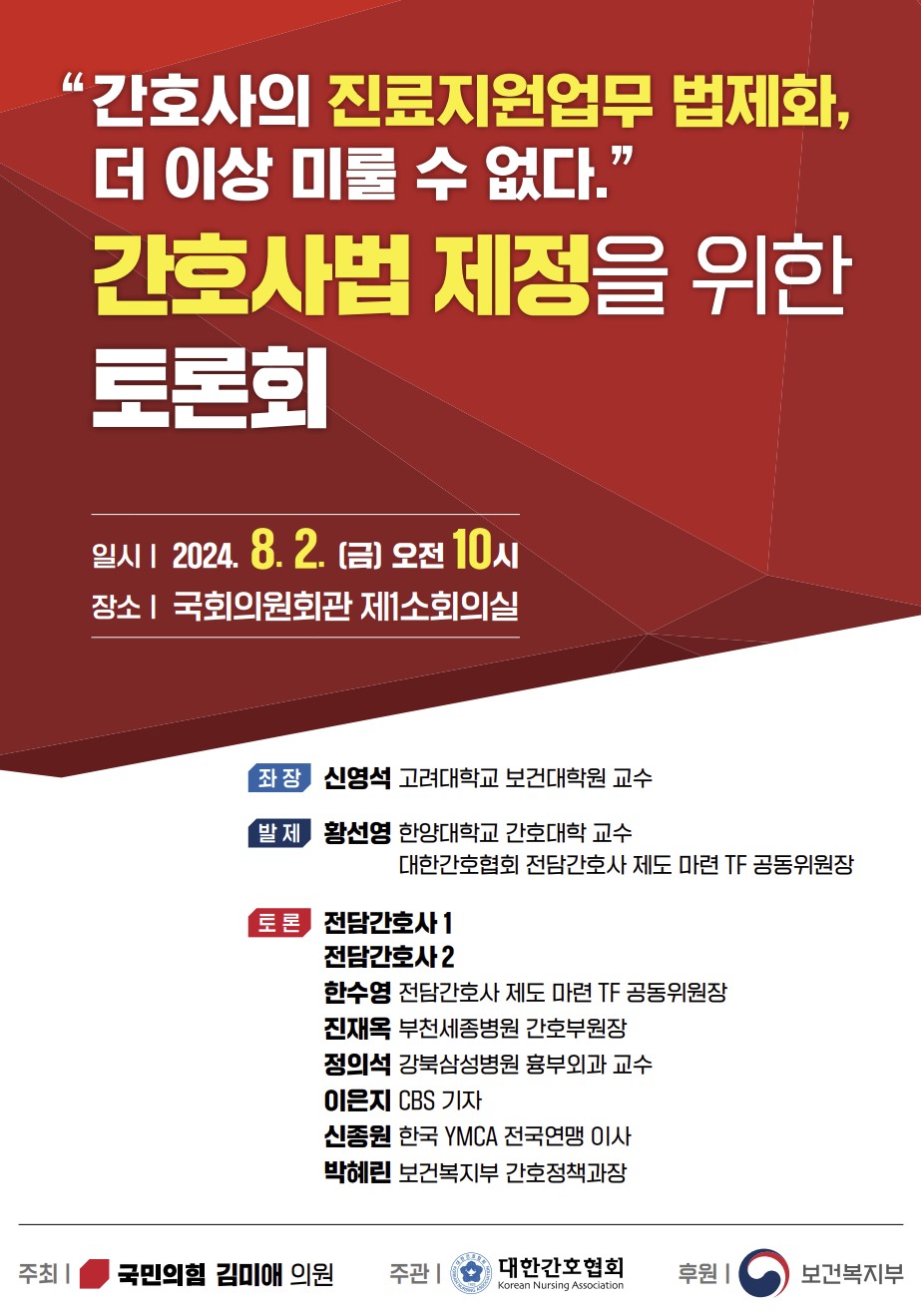 토론회는 국민의힘 김미애 의원이 주최하고 대한간호협회가 주관하며 보건복지부가 후원한다.