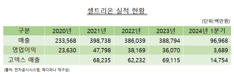 2일 금융감독원 전자공시시스템에 따르면, 셀트리온제약의 매출은 최근 3년간 4000억원을 밑돌며 정체 상태를 보이고 있다. 매출은 지난 2021년 3987억원, 2022년 3860억원, 지난해 3888억원 등으로 집계됐다. 2020년에는 2336억원을 기록한 바 있다.