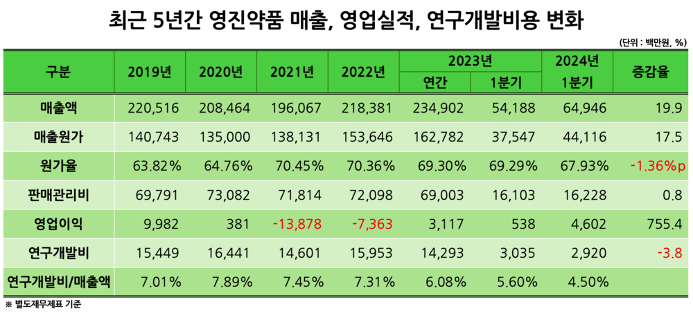 다만 R&D 투자 비중 감소에도 불구하고 영진약품은 오픈이노베이션으로 R&D 진행 방향을 전환하며 비용 절감에 나서면서도 연구개발 지속 의지를 드러냈다.