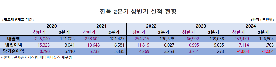 4일 전자공시시스템에 따르면, 한독은 별도재무제표 기준 2분기 매출액 1268억원, 영업이익 17억원, 당기순손실 46억원을 기록한 것으로 잠정 집계됐다.
