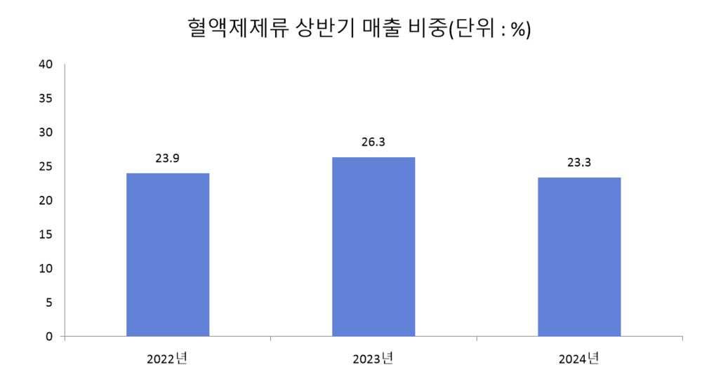 매출 하락세에 전체 매출 비중도 소폭 감소했다. 메디파나뉴스가 이 회사 실적 자료를 분석한 결과, 올해 상반기 혈액제제류 매출 비중은 전년 동기 대비 약 3%p(포인트) 감소한 23.3%로 나타났다. 또 2022년 상반기 매출 비중 23.9%보다는 0.6%p 낮았다.
