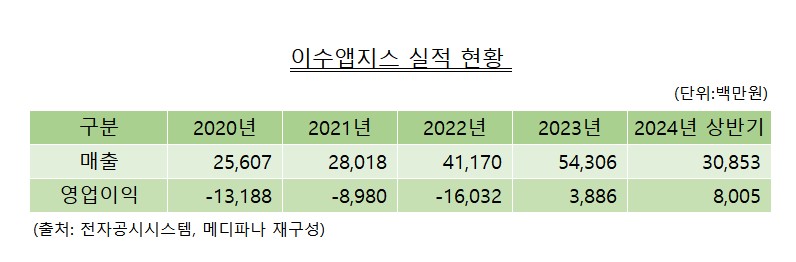 8일 전자공시시스템에 따르면, 이수앱지스는 2분기 매출액 143억원, 영업이익 48억원을 기록했다. 이는 전년 동기 대비 각각 12.3% 감소, 5708.5% 증가한 수치다.