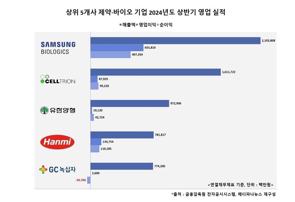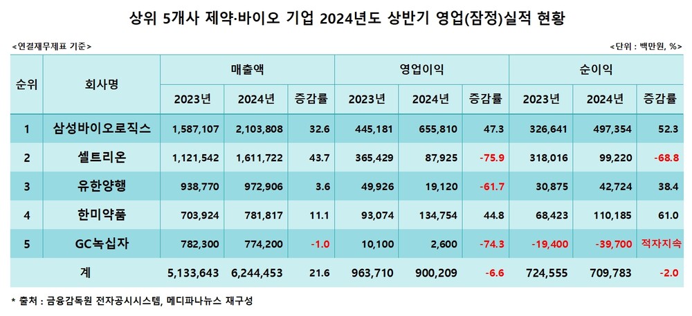 8일 메디파나뉴스가 제약·바이오 주요 기업 상위 5개사의 2024년도 상반기 잠정 실적을 집계한 결과, 전반적으로 전년 동기 대비 실적이 크게 성장하거나, 영업이익과 순이익 부문이 일시적인 요인으로 크게 하락하는 추세를 나타냈다.