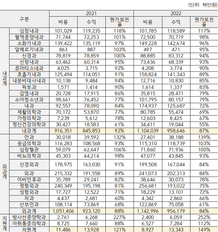 외과계 역시 1조1429억원을 투입해 9561억원을 벌었다. 원가보전율은 84%다.