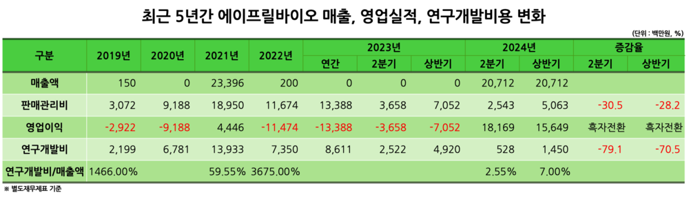 그러나 2022년 기술특례로 코스닥 상장에 성공한 에이프릴바이오는 2023년과 올 1분기 매출이 전무했다. 이는 개발 중인 후보물질 기술이전 사업화 순연 및 조기종료에 따른 것이다. 영업이익은 2021년 45억원을 기록한 이후 적자전환해 2022년 115억원, 2023년 134억원, 2024년 1분기 25억원의 영업손실을 기록했다.