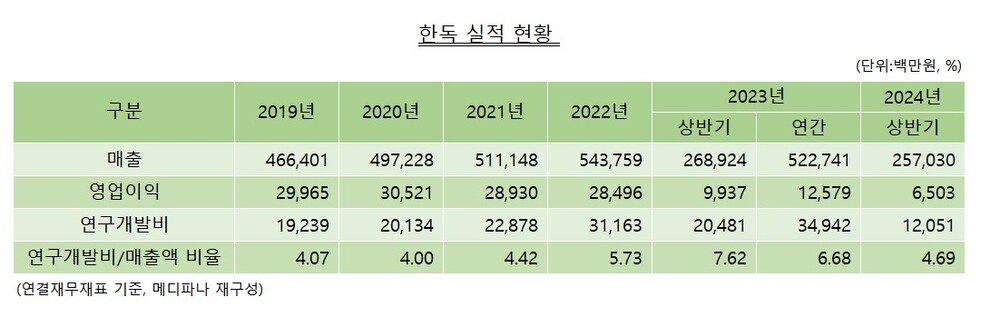 한독 관계자는 메디파나뉴스와의 통화에서 "지난해 대형 프로젝트로 연구비가 발생하면서, 올해 상반기 계획보다 적은 금액을 연구개발비에 투입하게 됐다"며 "하반기에 추가적인 연구개발비 사용으로 예년과 비슷한 수준을 유지하게 될 것"이라고 말했다.