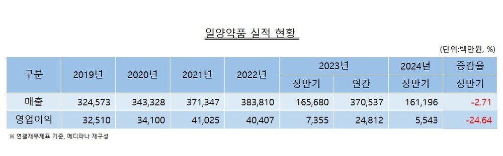 지난 5년간 실적 추이를 살펴보면, 일양약품은 연결 기준 2019년 3433억원에서 2022년 3838억원까지 꾸준히 매출 증가세를 이어왔지만, 지난해 3705억원을 기록하면서 감소세로 돌아섰다. 이후 감소세는 올해 상반기까지 이어지고 있다.
