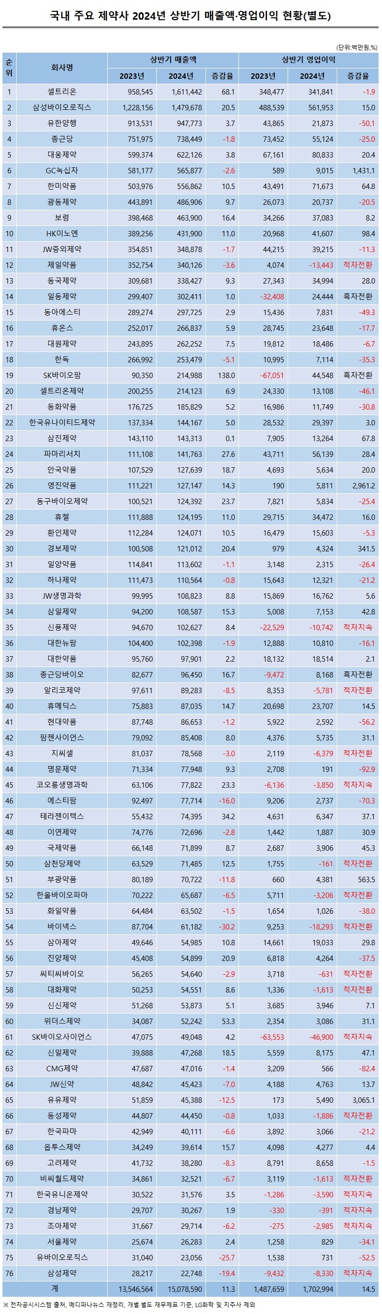 메디파나뉴스가 76개 주요 상장(코스피·코스닥) 제약·바이오 업체 별도·개별 재무제표 기준 올해 상반기 실적을 집계한 결과, 총 매출액은 15조786억원으로 전년 동기 13조5466억원 대비 11.3% 증가했다.