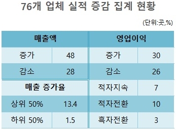 76개 업체 중 영업이익이 늘어난 업체가 30곳, 흑자전환이 이뤄진 업체가 3곳이었다. 반면 영업이익이 줄어든 업체가 26곳, 적자가 지속되거나 적자로 전환된 업체가 17곳이었다.