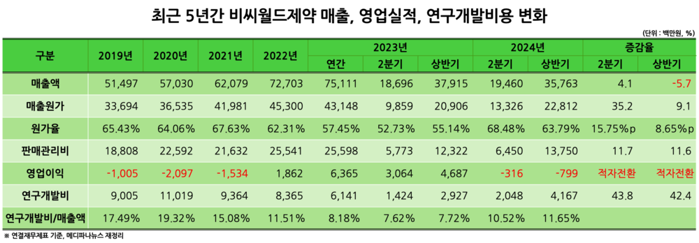 2019년 65.43%이던 매출원가율은 지속 감소하며 2023년 57.45%를 기록했다. 그러나 올해 상반기 63.79%로 다시 상승하며 수익성 악화에 영향을 미쳤다. 아울러 올 상반기 비씨월드제약 매출원가는 228억원으로 전년 동기 209억원 대비 9.1% 증가했다.