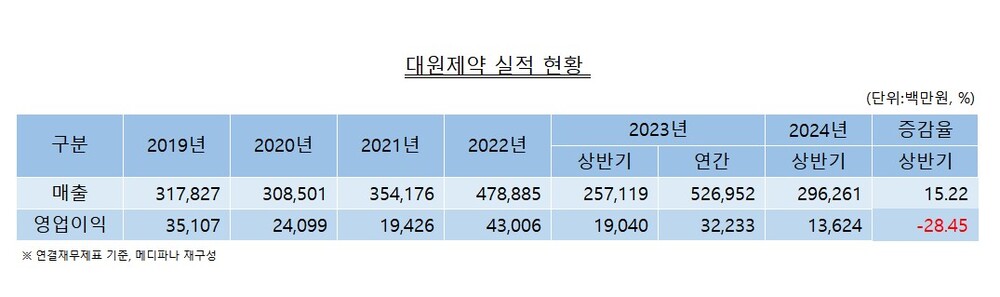 18일 전자공시시스템에 따르면, 대원제약의 상반기 매출액은 2963억원, 영업이익은 136억원을 기록했다. 매출은 지난해 상반기 2571억원과 비교해 15% 상승했으며, 영업이익은 같은 기간 190억원에서 28% 정도 감소했다.