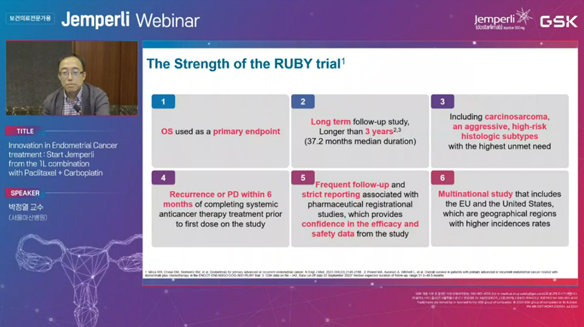 이번 웨비나에서 서울아산병원 산부인과 박정열 교수는 '자궁내막암 1차 치료의 혁신: 젬퍼리와 백금기반 화학요법 병용 치료(Innovation in Endometrial Cancer treatment: Start Jemperli from the 1L combination with Paclitaxel+Carboplatin)'를 주제로 면역항암제 기반의 1차 치료 중요성에 대해 강조했다.
