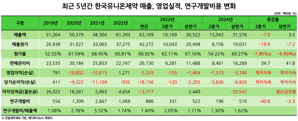 한국유니온제약은 2020년 영업손실 108억원을 기록한 이후 2022년 영업이익 13억원을 제외하면 줄곧 적자를 기록했다. 당기순손실은 2020년 93억원에서 2023년 182억원으로 늘어났다.
