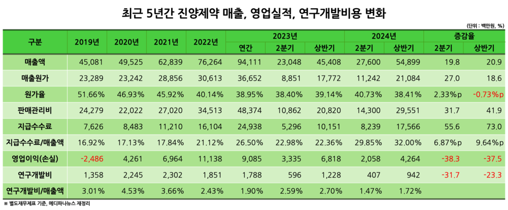 진양제약은 최근 5년간 급격한 외형 성장세를 기록했다. 별도재무제표 기준 2019년 451억원이던 매출은 지속 성장해 2023년 941억원으로 두 배 넘게 증가했다. 올해 상반기 매출 549억원을 기록한 점과 급격한 외형 성장세를 고려하면 올해 매출 1000억원을 돌파하는 것도 어렵지 않아 보인다.