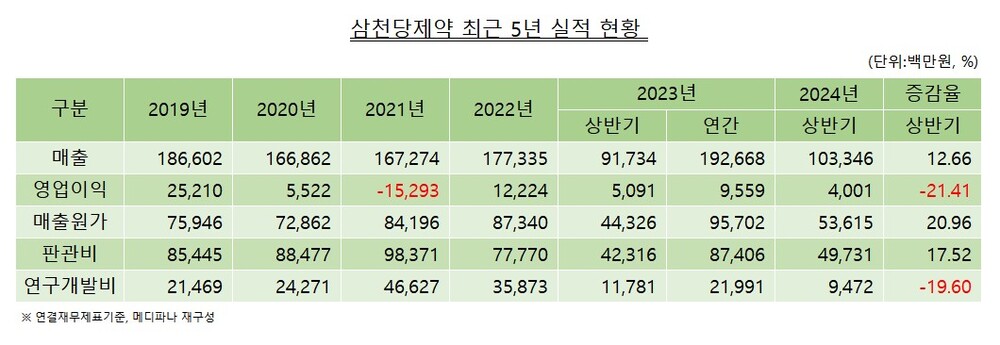 26일 전자공시시스템에 따르면, 삼천당제약은 올해 상반기 매출 1033억원, 영업이익 40억원을 기록했다. 이는 지난해 상반기 매출 917억원보다 12.7% 상승, 영업이익은 같은기간 51억원 대비 21.4% 감소한 수치다.