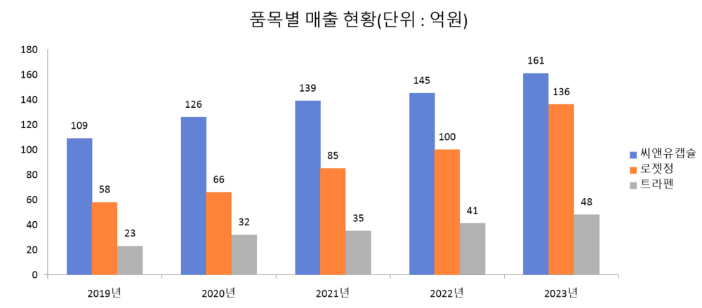 콜레스테롤담석증 치료에 쓰이는 씨앤유캡슐 매출은 2019년 109억원에서 2020년 126억원으로 15.6% 증가했다. 해당 품목 2021년, 2022년 매출은 138억원, 145억원으로 전년 동기 대비 10%, 5.1% 늘어난 바 있다.