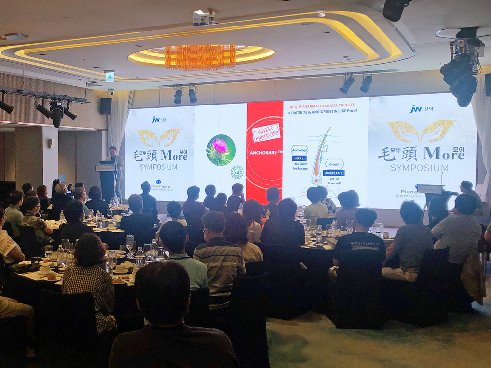 이번 심포지엄에서 연사로 나선 분당서울대병원 피부과 허창훈 교수는 새로운 모발 관리 방법으로 JW신약이 국내 출시한 '듀크레이 네옵타이드 엑스퍼트'를 소개했다. 허 교수는 모발 관리 화장품의 특장점과 함께 여성 환자도 안전하게 사용 가능한 점을 참석자들에게 설명하는 시간을 가졌다.